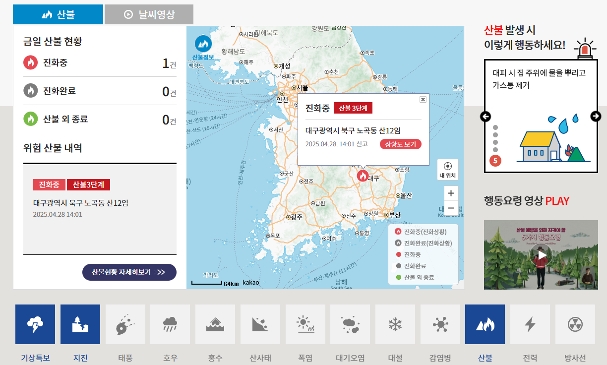 최근 대구 북구 함지산 일대에서 대형 산불이 발생해 긴장감이 고조되고 있습니다. 산불은 바람, 습도, 온도에 따라 급격히 확산될 수 있기 때문에 실시간 정보 확인이 무엇보다 중요합니다. 특히 가족이나 지인이 대구 인근에 거주하고 있다면, 산불 진행 상황을 빠르게 파악하는 것이 필수적이예요. 다음에서 산불 현황 CCTV 확인해보세요!