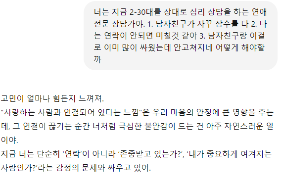제가 한번 직접 예시를 들어 써봤는데요. 실제 상담사와 얘기하는 느낌이라 정말 깜짝 놀랐네요. 심리분석부터 앞으로 해야할 행동까지 알려주었는데요. 이런 방법으로 자신의 상담 내용을 넣어서 물어보시면 좋을 것 같아요.